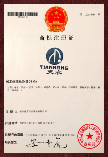2002年公司在國家商標局登記注冊了“天農”、“綠農”商標,合作建立果蔬基地,保證“天農”、“綠農”果蔬品質。